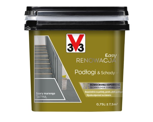 Farba Easy Renowacja podłogi & schody V33 służy do malowania podłóg drewnianych, płytek podłogowych i schodów. Technologia ceramiczna tworzy strukturę siatki. Wzmacnia ona warstwę farby: jest zarówno elastyczna aby absorbować napięcia i uderzenia oraz wytrzymała na intensywne użytkowanie.