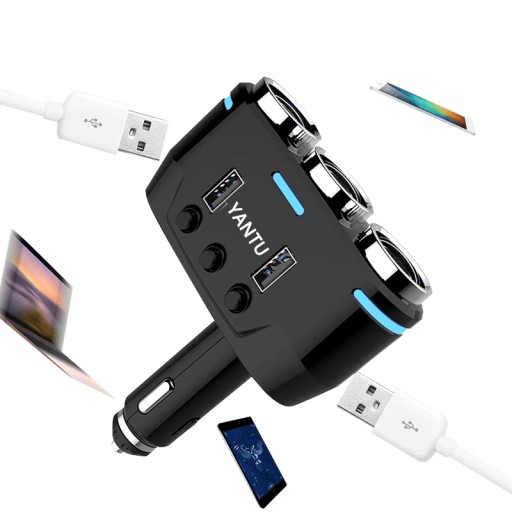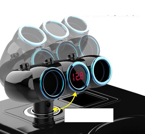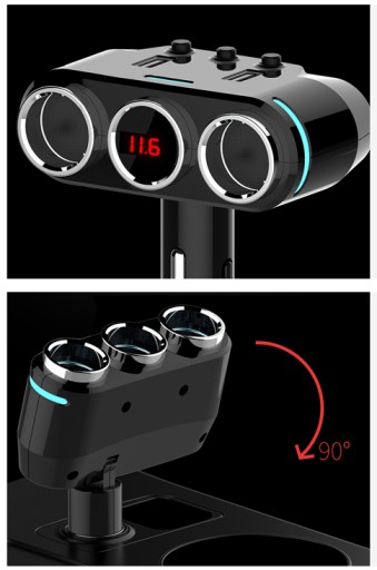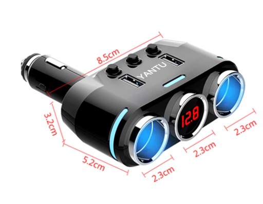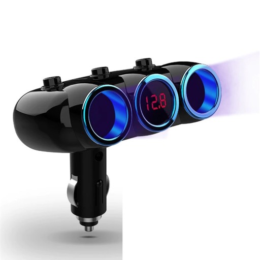 Rozdzielacz na dwa gniazda zapalniczki z cyfrowym woltomierzem wyświetlającym aktualny poziom napięcia akumulatora i dwoma portami USB szybkiego ładowania. Zestaw umożliwia jednoczesne korzystanie ze wszystkich gniazd, czyli ładowanie np. nawigacji i telefonu w tym samym czasie. Każde gniazdo zapalniczki podsiada osobny włącznik / wyłącznik i jest podświetlone na niebiesko diodami LED. Rozdzielacz wyposażony jest w ochronę przed zwarciem, przegrzaniem oraz ochronę przed zbyt dużym napięciem.