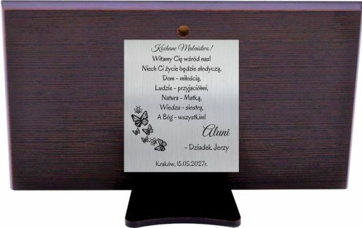Dedykację docelowo grawerujemy na tabliczce ze srebrnego laminatu. Na życzenie możemy wygrawerować ją na złotym laminacie grawerskim lub bezpośrednio na drewnie. Szczególnie polecamy wybór graweru na drewnie z uwagi na jego szlachetny i oryginalny wygląd.