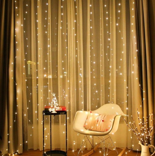 - SPECYFIKACJA – kolor świecenia: ciepły biały; ilość lampek: 300 LED; zasilanie USB; moc: 6W; IP20; wymiar kurtyny świetlnej: 3x3 m; długość przewodu: 5m; waga: 0,11kg; waga w opakowaniu: 0,159kg.