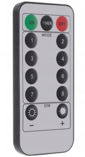 - PILOT + TIMER – do zestawu został dołączony pilot z 8 trybami świecenia oraz z włącznikiem i wyłącznikiem. Posiada także zdalną regulację jasności świecenia. Dodatkowo ma timer, który po włączeniu jest zaprogramowany na 6h świecenia, potem ma 18 godzinną przerwę i znów 6 godzin świecenia.