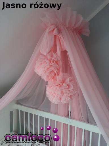 Uniwersalny baldachim wykonany jest z tiulu szyfonowego + 2 pompony z estetycznym wykonaniem