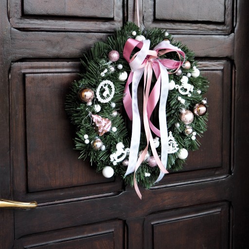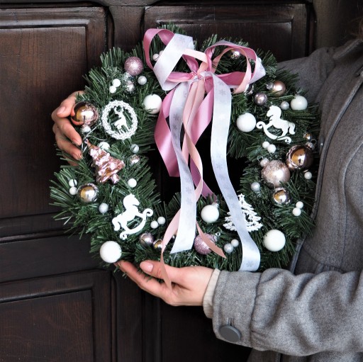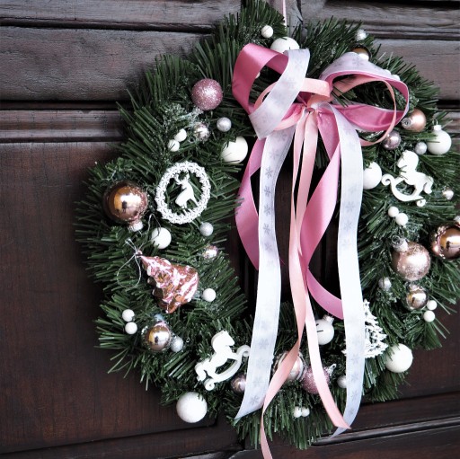 - Świąteczny wianek na drzwi został wykonany przez Nas ręcznie z wysokiej jakości materiałów. Zawiera on: przeurocze drewniane ozdoby w różnych świątecznych kształtach w kolorze białym, bombki z nietłukącego szkła różnych rozmiarów (jak na zdjęciach) w kolorze białym, różowym i srebrnym, uroczą bombkę plastikową w kształcie choinki, brokatowe kuleczki w kolorze białym i srebrnym. Całość oprószona jest sztucznym śniegiem.