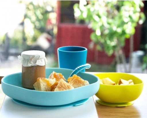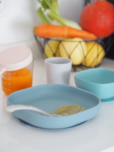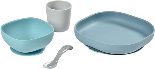 Komplet naczyń z silikonu francuskiej marki BEABA składa się z talerzyka, miseczki, kubka i łyżeczki treningowej. Wszystkie elementy zestawu charakteryzuje ergonomiczny, zaokrąglony kształt i miękkie, gładkie brzegi. Wyższe boki miseczki i talerzyka ułatwiają dziecku samodzielne nabieranie posiłku na widelec czy łyżkę. Naczynia te mają na spodzie antypoślizgową przyssawkę, dzięki czemu są stabilne i dobrze trzymają się stołu. Kubeczek jest poręczny i wygodny do nauki picia, a łyżeczka idealnie dopasowuje się do dziecięcej buzi i można ją odłożyć tak, by główka nie dotykała powierzchni, dzięki czemu jej używanie jest o wiele bardziej higieniczne.
