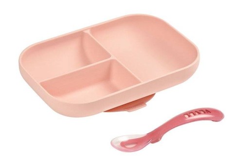 Komplet naczyń z silikonu francuskiej marki BEABA składa się ze sporego trójdzielnego talerzyka-miseczki i łyżeczki treningowej. Wszystkie elementy zestawu charakteryzuje ergonomiczny, zaokrąglony kształt i miękkie, gładkie brzegi. Podział talerza na trzy przestrzenie (150 ml + 90 ml + 90 ml) pozwala podzielić posiłek na porcje, co ułatwi malcowi naukę samodzielnego jedzenia, oraz właściwe komponowanie posiłków. Wyższe boki pomagają dziecku samodzielnie nabierać jedzenie. Naczynie ma na spodzie antypoślizgową przyssawkę, dzięki czemu jest stabilne i dobrze trzyma się stołu. Łyżeczka idealnie dopasowuje się do dziecięcej buzi i można ją odłożyć tak, by główka nie dotykała powierzchni, dzięki czemu jej używanie jest o wiele bardziej higieniczne.