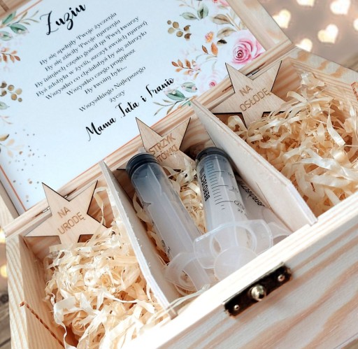 - wewnątrz 3 przegrody oraz drewniane gwiazdki z napisami