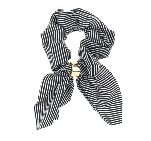 Scrunchie w czarne paski z elementem ozdobnym w kolorze złotym.