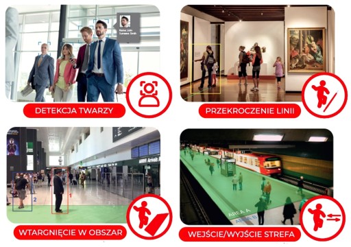 - Obsługa kamer z funkcjami analitycznymi - ochrona perymetryczna, wykrywanie twarzy, SMD+, zliczanie osób;