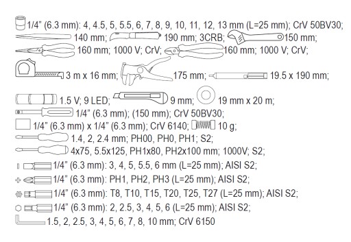 Profesjonalny zestaw narzędziowy dla elektryków. Zawiera 68 specjalnie wyselekcjonowanych narzędzi. Jest to doskonała propozycja zarówno dla branży elektroinstalacyjnej, jak i motoryzacyjnej. Szczypce i wkrętaki w zestawie posiadają izolowane do 1000V rękojeści VDE.