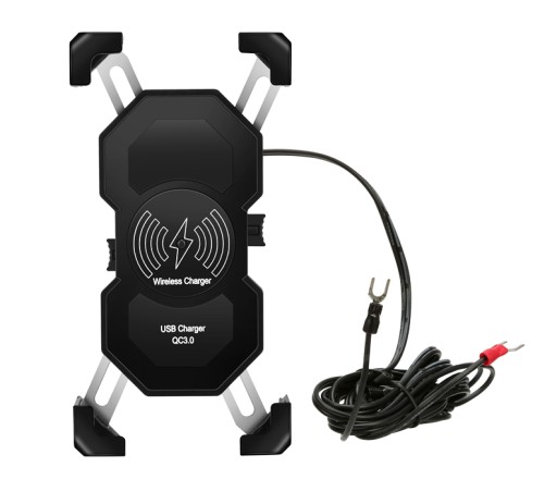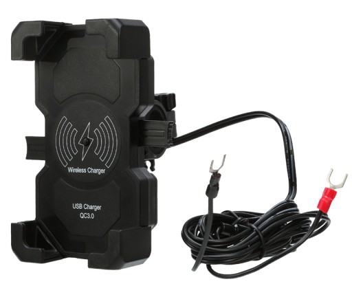 Najważniejszą zaletą uchwytu jest ładowanie indukcyjne o mocy 15W oraz wodoodporne gniazdo USB szybkiego ładowania QC3,0, dzięki któremu już nigdy nie rozładuje Ci się telefon podczas wyprawy. Uchwyt posiada włącznik ON/OFF i kabel o długości ok. 150cm zakończony "oczkami" pod klemy akumulatora.