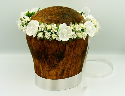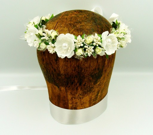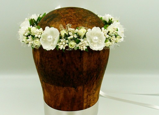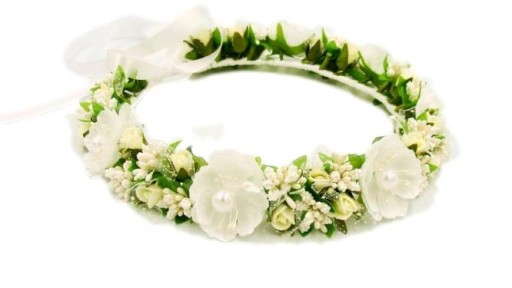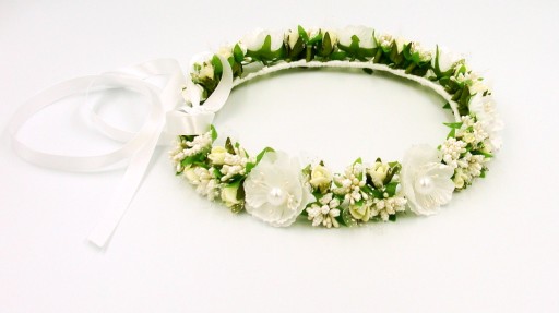 Uroczy wianek wykonany z różyczek piankowych ozdobiony białymi pręcikami.