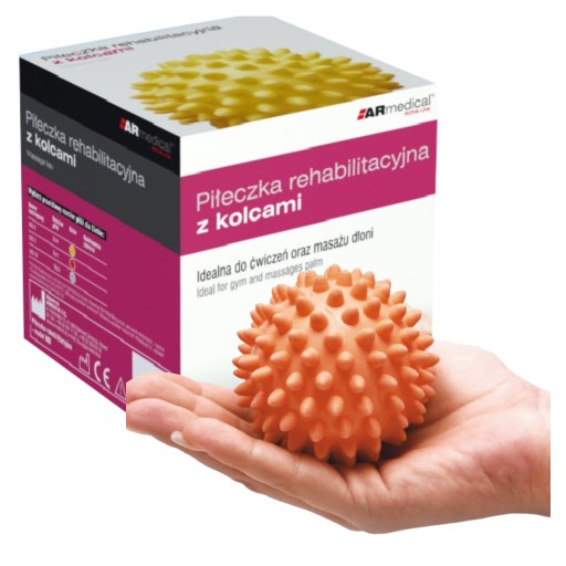 Piłeczka rehabilitacyjna z kolcami przeznaczona jest do ćwiczeń, rehabilitacji oraz masażu dłoni.