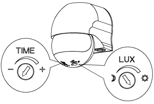 Potencjometrem czasu ustawiamy czas, po którym oświetlenie ma się wyłączyć od momentu wykrycia ostatniego ruchu przez czujnik. Aby zwiększyć czas zwłoki należy potencjometr czasu przekręcić zgodnie z ruchem wskazówek zegara. Maksymalna zwłoka czasowa wynosi około 5-9 minut. Aby zmniejszyć czas zwłoki należy potencjometr czasu przekręcić w kierunku przeciwnym do ruchu wskazówek zegara. Minimalna zwłoka czasowa wynosi około 7-13 sekund.