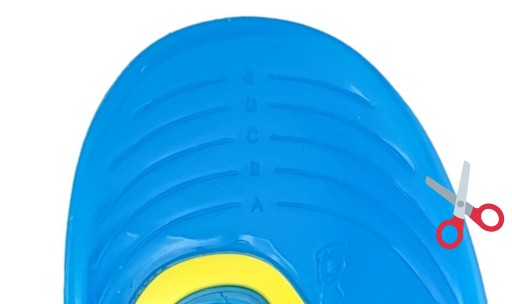 - Wkładki posiadają zakres rozmiaru. Przytnij wkładkę po specjalnych liniach pomocniczych, które są wytłoczone na wkładce aby dopasować wkładkę do swojej stopy