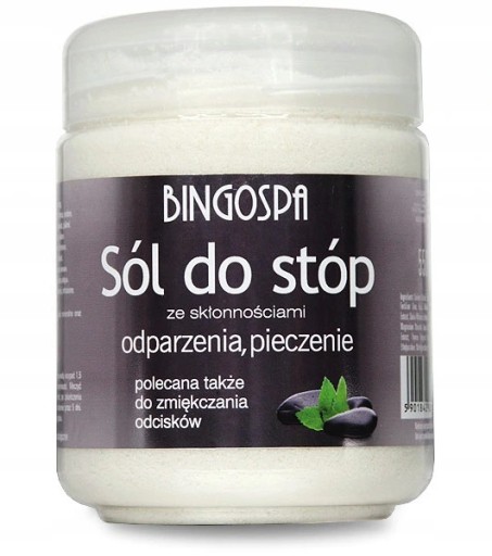 Sól do stóp marki BINGOSPA. Stworzona specjalnie dla osób z problemem często odparzających się i pieczących stóp. Zawiera dobroczynne ekstrakty z szałwii, melisy i rumianku, posiadające działanie antybakteryjne i antygrzybiczne, dzięki czemu skutecznie hamuje rozwój drobnoustrojów i grzybów. Dodatkowo przywraca skórze jej naturalne pH oraz delikatnie nawilża i zmiękcza, łagodzi i odpręża. Produkt można również stosować przy uporczywych, twardych odcisków jako środek zmiękczający.