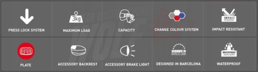 - Możliwość zainstalowania opcjonalnego światła stopu oraz wygodnego oparcia pozwala zwiększyć bezpieczeństwo motocyklisty i komfort pasażera