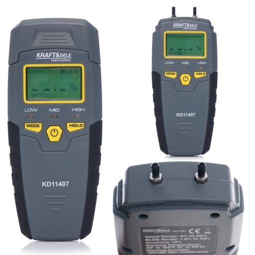 Miernik wilgotności marki Kraft&Dele Model KD11407 mierzy zawartość wilgotności, wykrywając rezystywność elektryczną materiału docelowego za pomocą dwóch pinów. Urządzenie ma inteligentną konstrukcję jednoukładową o niskim zużyciu energii, zawartość wilgoci jest wyświetlana na wyświetlaczu LCD.