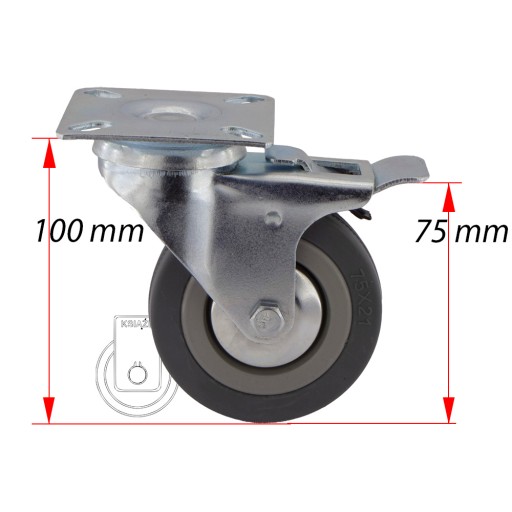 - OBUDOWY wykonane są blachy stalowej o dużej wytrzymałości. Płytka ma wymiary 65 mm x 65 mm. Kółka mają średnicę 75 mm, a centra mocowań mają wymiar 45 x 45 mm i owalne otwory do mocowania o wymiarach 15 x 8,2 mm. Wysokość całkowita wynosi 100 mm.
