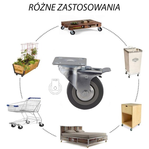 - KOŁO składa się z polipropylenowej piasty oraz z niebrudzącej gumowej opony, posiada łożysko ślizgowe. Kółka mają wytrzymałość po 70 kg na kółko. Wolno się zużywają, są odporne na uszkodzenie, amortyzują uderzenia i wibracje. Obracają się o 360 stopni ułatwiając manewrowanie meblami czy wózkiem. Gładko obracają się po twardych i gładkich powierzchniach jak beton przy bardzo małym tarciu.