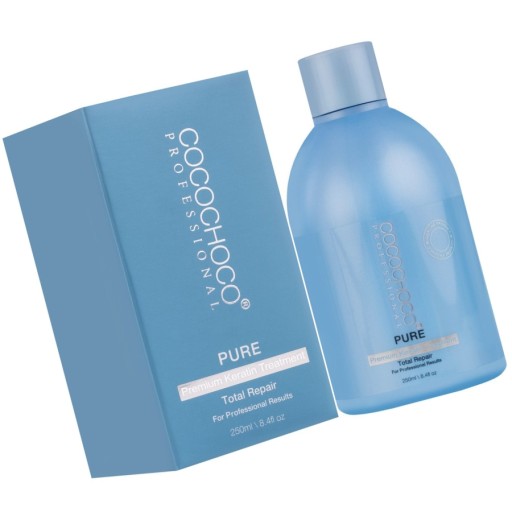 - Ten profesjonalny produkt da dodatkowy połysk, blask oraz wyjątkową miękkość włosów, na długi czas (efekt zabiegu utrzymuje się ok 4 miesiące). CocoChoco Pure z czystej postaci keratynowymi proteinami jest stworzona specjalnie dla wyjątkowo osłabionych i zniszczonych włosów. Organiczne skondensowane składniki, naturalna woda oraz mineralny silikon, a także najwyższa zawartość czystej keratyny w produkcie, pomoże osiągnąć spektakularny efekt odnowy włosów. Dzięki wykonaniu zabiegu przy użyciu tego kosmetyku włosy odzyskają zdrowy i sprężysty wygląd - powrócą do ich naturalnej, zdrowej struktury. Każdy włos z osobna zostanie intensywnie odbudowany i zregenerowany.