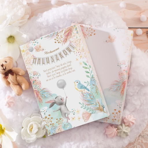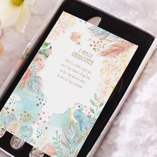 - W środku znajduje się kartka z życzeniami na urodzinki