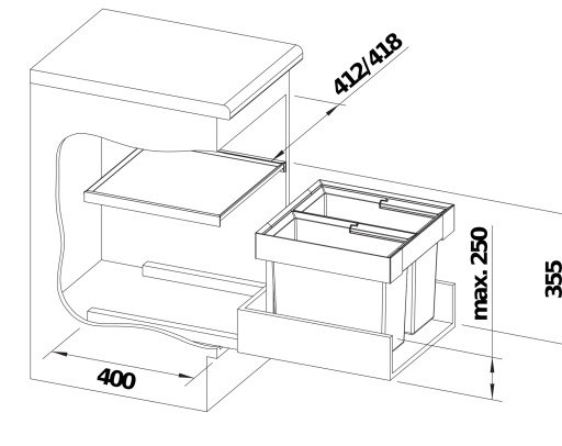 - Wysokość montażowa pokrywy selektora 370 mm powyżej dna szuflady, głębokość montażowa 400 mm.