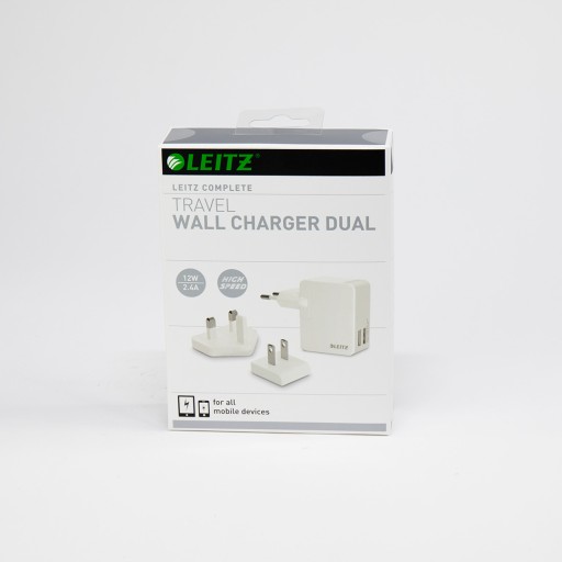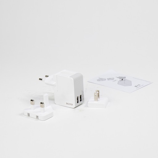 Przedmiotem sprzedaży jest nowy zasilacz sieciowy Leitz Complete Travel do ładowania telefonów i tabletów o mocy 12 W i prądzie 2.4 A.