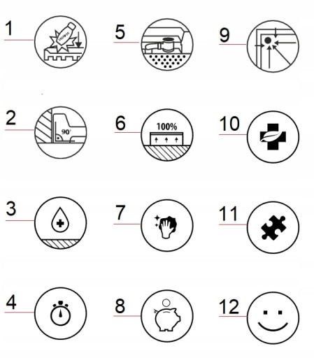Dzięki celowemu zastosowaniu uszczelek w kolorze przezroczystym, kabina zachowuję przez wiele dni walory estetyki i higieny. Mniej widoczne są zabrudzenia, kamień i zabrudzenia z preparatów, które osadzają się w trudno dostępnych miejscach.