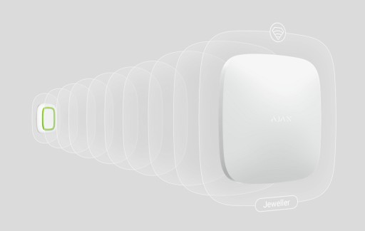 Przycisk alarmowy Ajax komunikuje się z hubem za pomocą protokołu radiowego Jeweller na odległość do 1300 m. Gdy wygeneruje alarm, zobaczysz zielone mrugnięcie. Jeweller szyfruje wszystkie przesłane dane. W przypadku zakłóceń sygnału radiowego system Ajax przełącza częstotliwość radiową i powiadamia ciebie, a także agencję ochrony, o zaistniałej sytuacji.