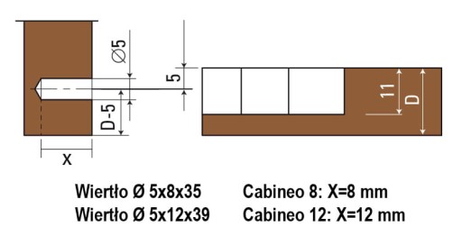 Specjalna podziałka milimetrowa u podstawy TRIMATIC® ułatwia wywiercenie nieprzelotowego otworu fi 5 mm (patrz rysunek poniżej). Należy zamontować wiertło w określonej odległości od krawędzi nawiercanego panelu, stosując dystans "C" (patrz rysunek poniżej), którego rozmiar obliczany jest na podstawie grubości panelu "D" panelu - zgodnie z tabelą (3).