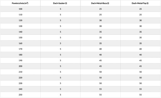 W poniższej tabeli znajdziesz orientacyjną ilość produktów potrzebną do pokrycia określonych powierzchni dachowych.