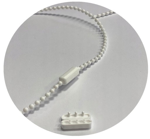 Łącznik łańcuszka kulkowego pasuje do rolet i żaluzji których średnica kulek jest od 3.0 mm do 3.2mm , a odległość między kulkami to 1mm. Jest to standardowa złączka do łańcuszków do rolet i żaluzji o średnicy kulki 3.2 mm