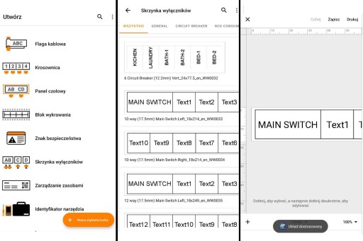 - Dedykowane funkcje tworzenia etykiet: Ogólne | Płyta czołowa | Panel krosowniczy | Łączówka | Owijka kablowa | Flaga kablowa | Rurka termokurczliwa | Szeregowanie (automatyczne zwiększanie liczby zamieszczonej na etykietach)