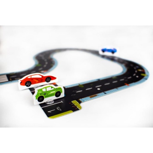 - opakowanie zawiera: 30 elementów (22 elementy drogi, 2 sygnalizatory, parking i stacja benzynowa) oraz kostkę i instrukcję