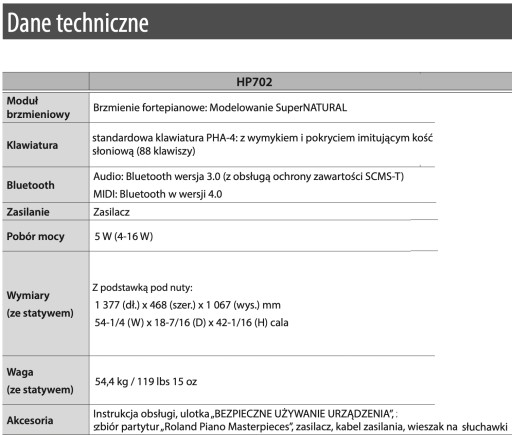 - Autentyczny dźwięk akustyczny, dzięki technologii Roland SuperNATURAL Piano Modeling
