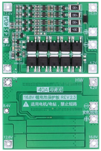 Moduł ładowarki z balanserem dla 4 ogniw li-Ion lub li-Pol 18650 i 26650 4S 40A 16,8V z zabezpieczeniem BMS oraz PCM. Moduł przeznaczony do urządzeń o mocy do 230W oraz prądzie chwilowym rozruchowym do 80A. Idealnie nadaje się do pakietów akumulatorów we wkrętarkach, należy wtedy pamiętać o podpięciu równolegle do styków silnika kondensator (10 uF-1000 uF).