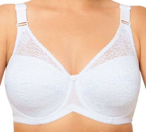 model 1325 zapinany 3 rzędy na 3 haftki,szerokie regulowane ramiączka,miseczki z fiszbinami i delikatną koronką,na środku subtelna ozdoba w postaci kokardki lub kwiatka