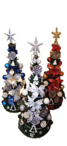Wykonujemy choinki z dekoracją w kolorze: srebrnym, białym, złotym, niebieskim, czerwonym, brązowym, zielonym, fioletowym lub mieszanym np. złoto-czerwona.