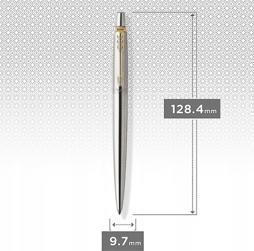 Stal nierdzewna, ze złotymi wykończeniami. Korpus wykonany mistrzowsko ze szlifowanej stali nierdzewnej. Klip wykończony złotem. W opakowaniu prezentowym Parker.