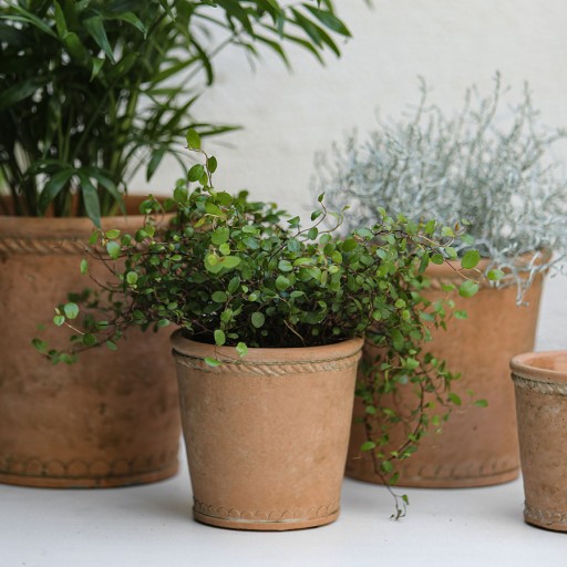 Doniczka wykonana z cementu w stylu rustykalnym w kolorze terakoty i naturalnej ziemi. Ozdobne ornamenty przy górnej krawędzi osłonki i przy podstawie będą przyjemnym dla oka akcentem w każdym pomieszczeniu lub w ogrodzie. Ta nie wielka doniczka sprawdzi się również nie tylko jako doniczka na kwiaty, czy zielone rośliny, ale także na zioła takie jak bazylia, mięta czy kolendra.