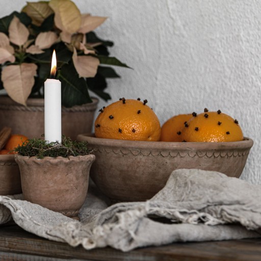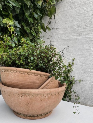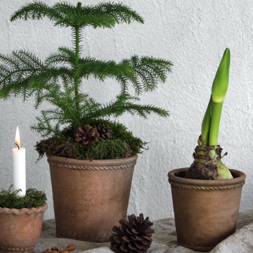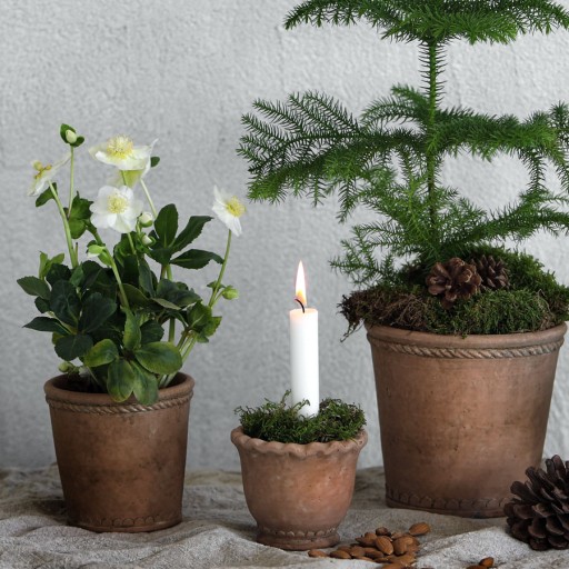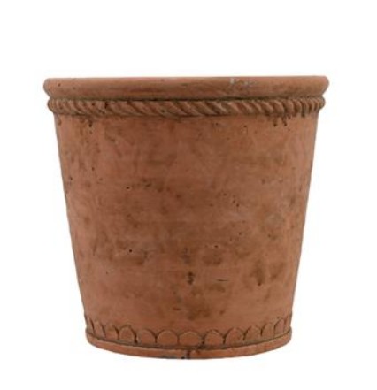 Doniczka wykonana z cementu w stylu rustykalnym w kolorze terakoty i naturalnej ziemi. Ozdobne ornamenty przy górnej krawędzi osłonki i przy podstawie będą przyjemnym dla oka akcentem w każdym pomieszczeniu lub w ogrodzie. Ta nie wielka doniczka sprawdzi się również nie tylko jako doniczka na kwiaty, czy zielone rośliny, ale także na zioła takie jak bazylia, mięta czy kolendra.