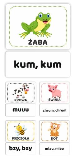 Zestaw składa się z 30 kart z obrazkami oraz 30 kart z wyrażeniami dźwiękonaśladowczymi.