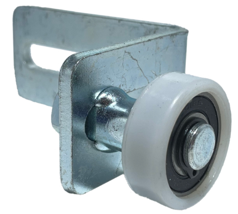 Rolka prowadząca o średnicy 35 mm służąca do utrzymania szyny (ceownika) w pionie w trakcie zamykania i otwierania. Rolka jest osadzona na łożysku. W komplecie kątownik montażowy.