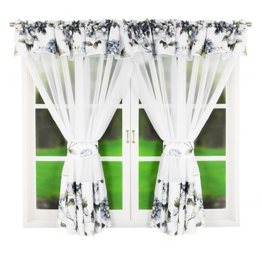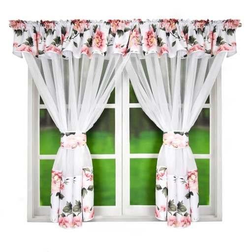 Piękna firana gotowa została uszyta z lekkiego śnieżnobiałego woalu w kolorze białym, połączonego z materiałem stretch panama. Góra oraz dół firany ozdobione są wzorem kwiatowym. Całość przyciąga wzrok i idealnie zdobi okno, nada niepowtarzalnego wyglądu każdemu pomieszczeniu.
