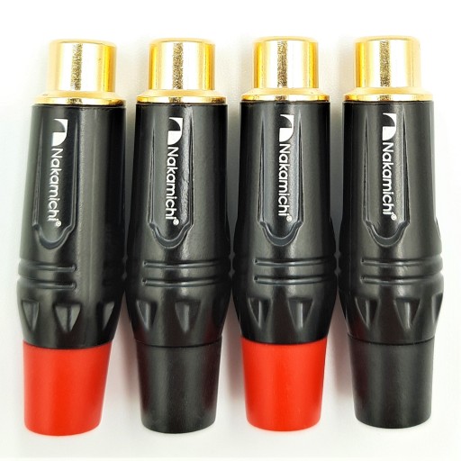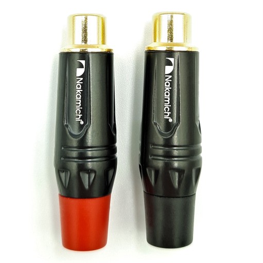 Wysokiej jakości, całkowicie metalowe wtyki żeńskie cinch RCA Nakamichi z silikonowym zaciskiem ogonowym. Platerowane 24k złotem. Izolacja teflonowa / elastyczny miedziany trzpień środkowy.