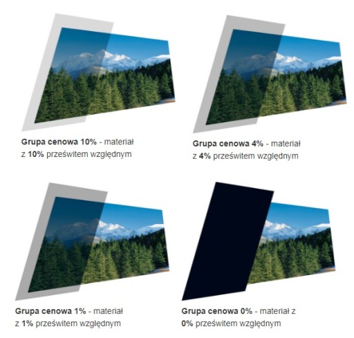 Materiały dostępne w wielu kolorach, w wersji z 10%, 4%, 1% i 0% prześwitem.