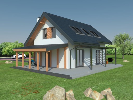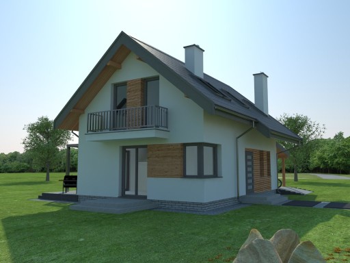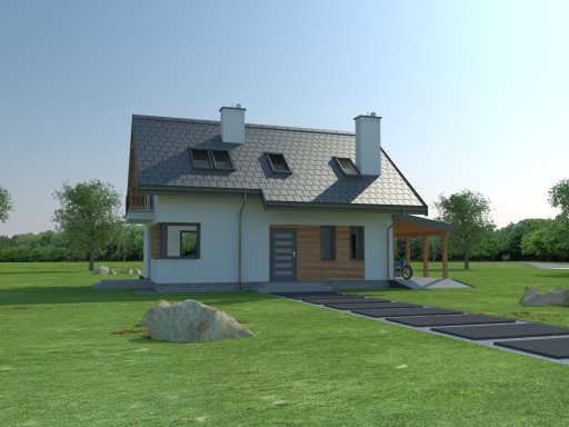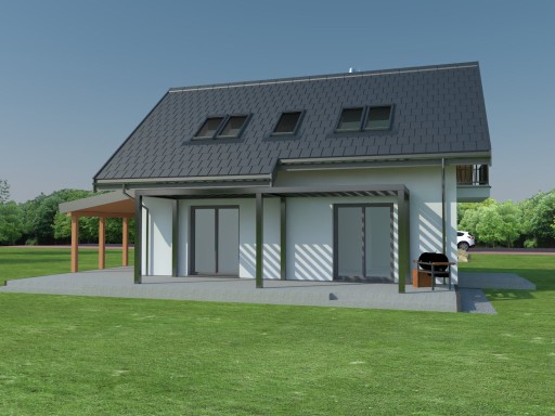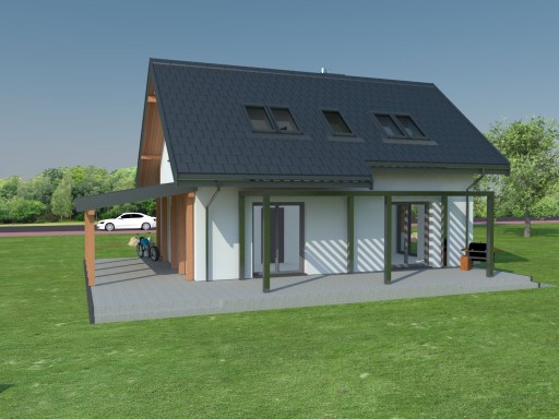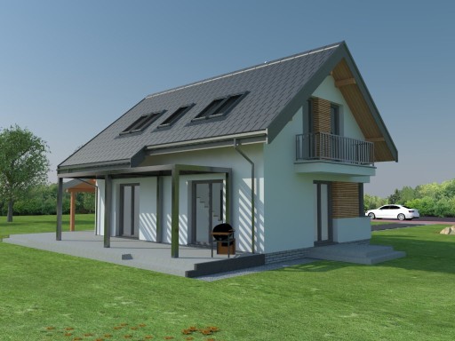 Budynek mieszkalny jednorodzinny z poddaszem użytkowym o powierzchni zabudowy 70 m2 (10 m x 7 m). Na poddaszu budynku pokoje z wyjściem na balkon. Zadaszenie w formie wiaty na bocznej elewacji budynku. Taras z kostki / płyt betonowych na gruncie z pergolą systemową stalową. Dowolność wyboru ogrzewania (paliwo stałe, gaz, pompa ciepła). W salonie zlokalizowany kominek. Dodatkowe wyjście z budynku poprzez kotłownie zlokalizowane na elewacji bocznej. Wentylacja grawitacyjna - kominy prefabrykowane. W pokoju pod schodami dodatkowe miejsce na zabudowę meblową.