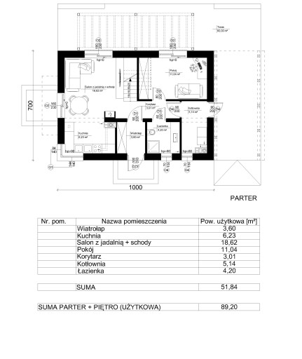 ŁĄCZNA POWIERZCHNIA PARTERU I PODDASZA: 89,2 m2