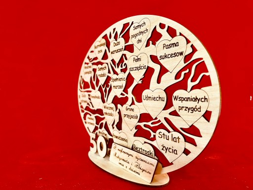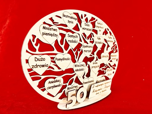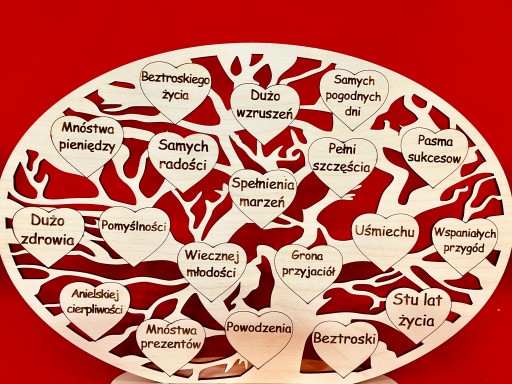 Przepięknie wycięte ze sklejki i grawerowane drzewko z życzeniami dla solenizanta.