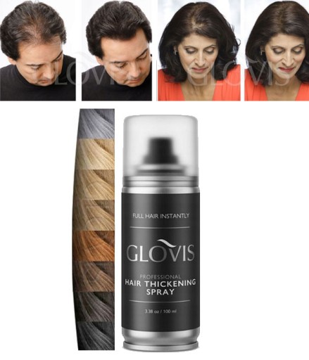 Całkowicie wodoodporne mikrowlókna w sprayu GLOVIS Thickener idealnie zagęszczające przerzedzone włosy.